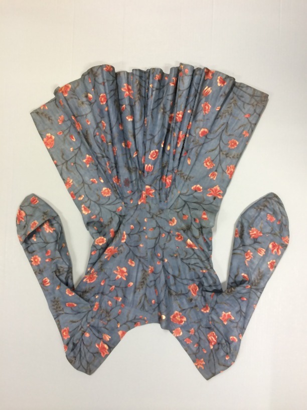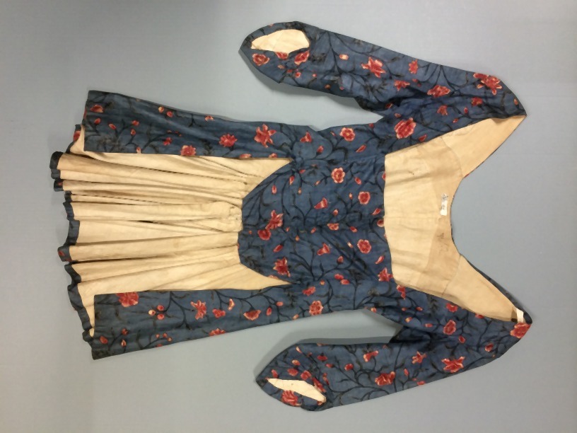 Sitsen vrouwenjak, met kleine vestpandjes en lange wijde schoot, beschilderd met golvende stengels met bloemen en bessen op blauwe grond