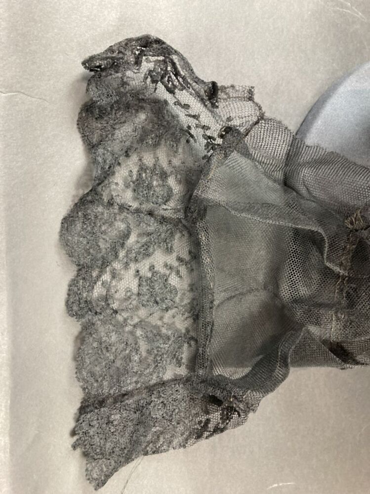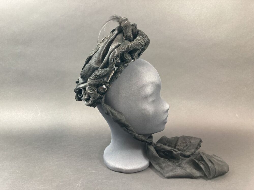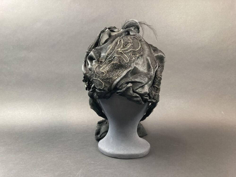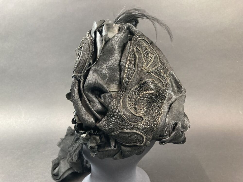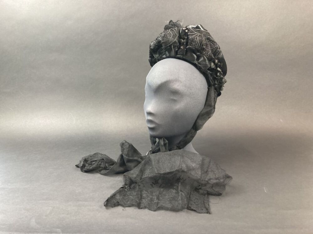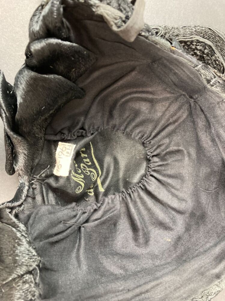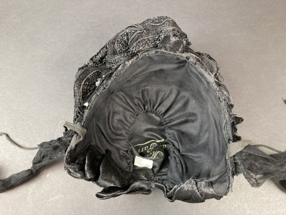 Oorijzerhoedje (kypske), versierd met strikken van zwart glas, in de bol Modes Paris