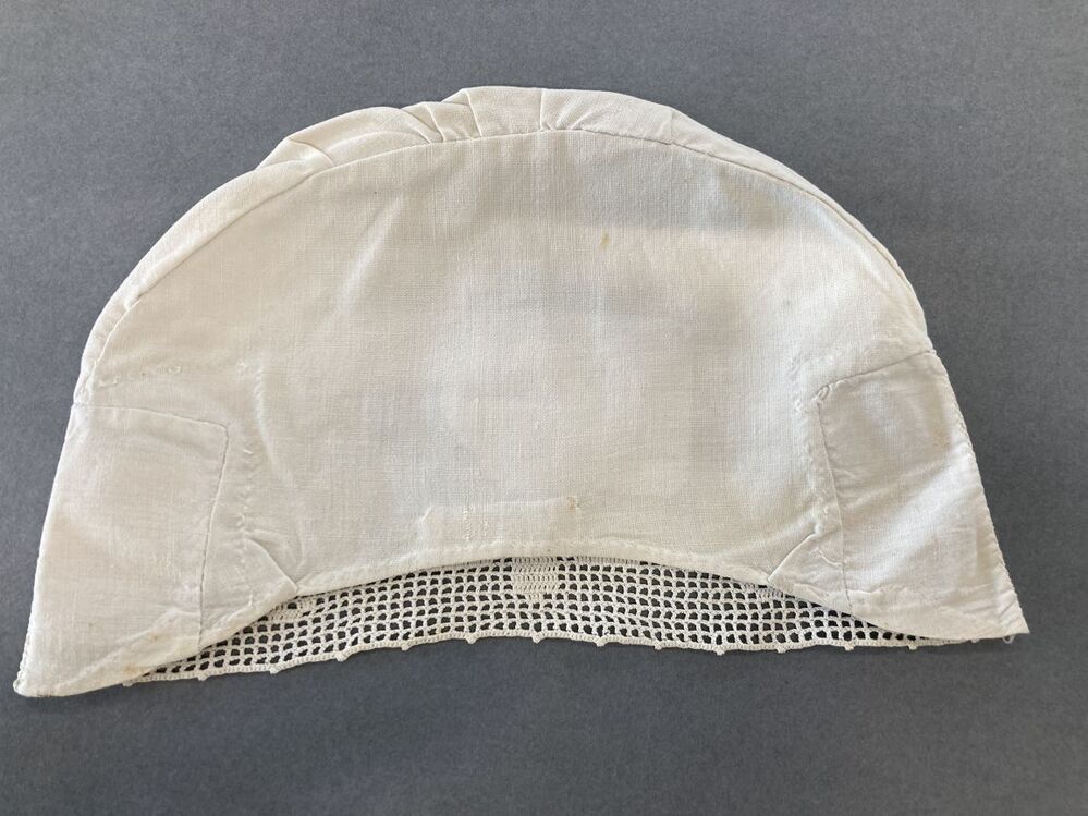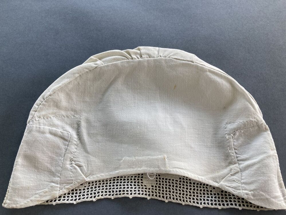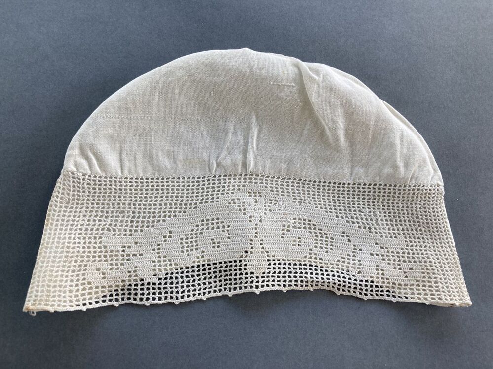 Witte ondermuts of tipmuts,met strook van filethaakwerk met groot symmetrisch motief