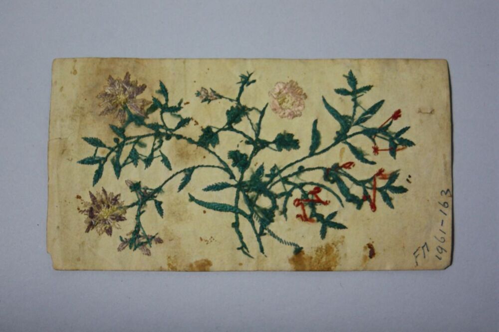 Langwerpig rechthoekig stuk papier waarop met gekleurde garens een bloem- en bladtakje geborduurd