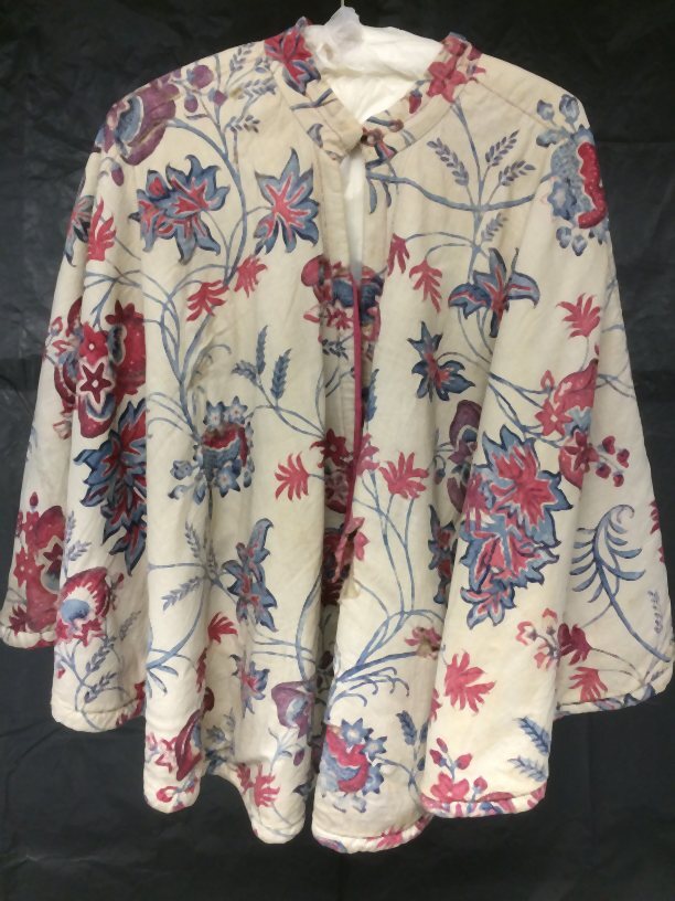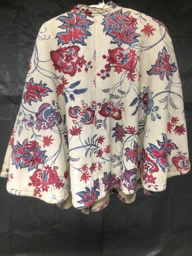 Sitsen schoudermantel met opstaande boord, cirkelvorm, met klimop ranken op witte grond gevoerd met geruwde wollen stof