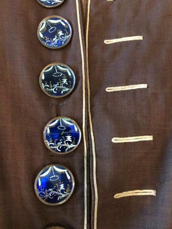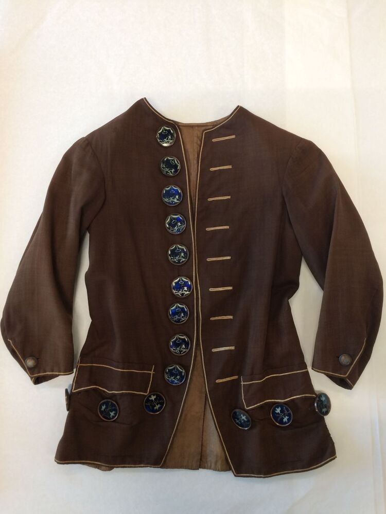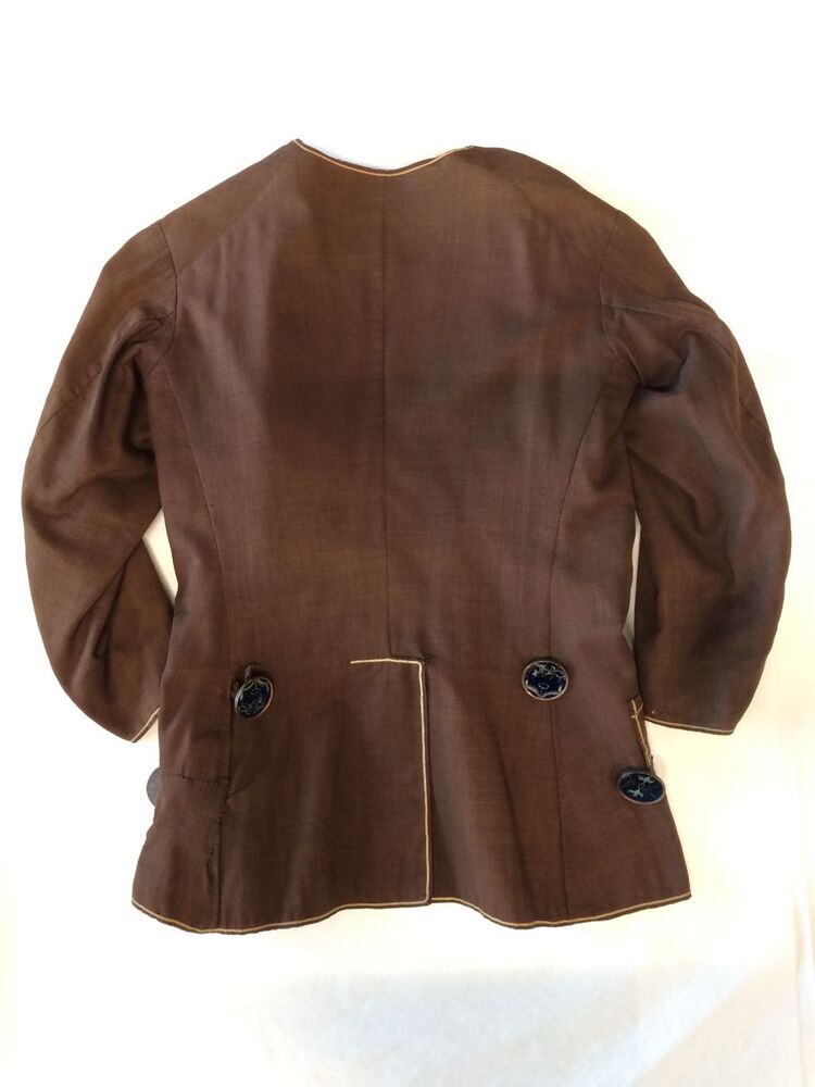 Jongensjas van donkerbruine wollen stof, met grote glazen knopen, langs de randen afgezet met creme biezen