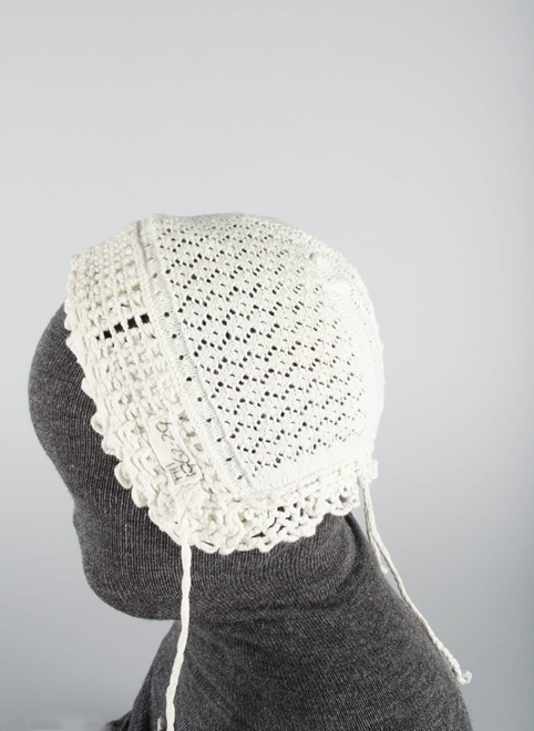 Mutsje van witte katoen ajour gebreid met vierkante bol en gehaakt randje