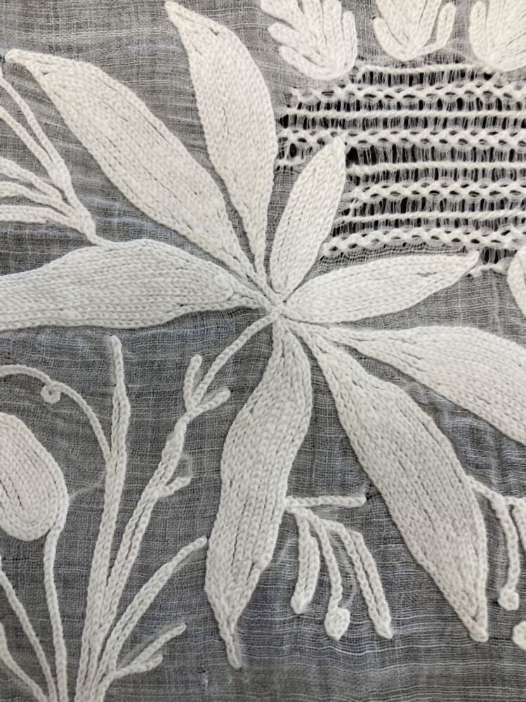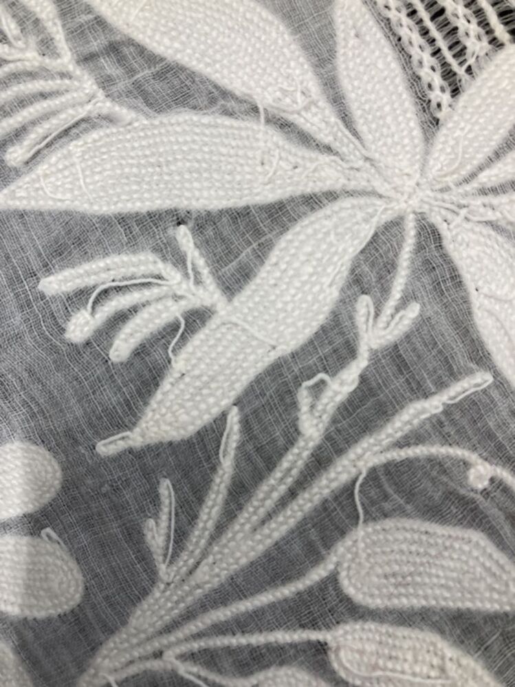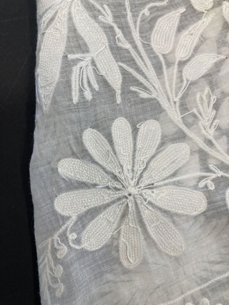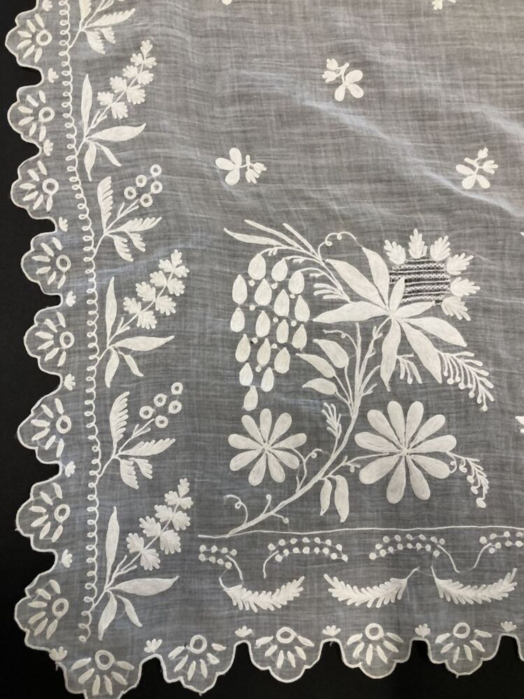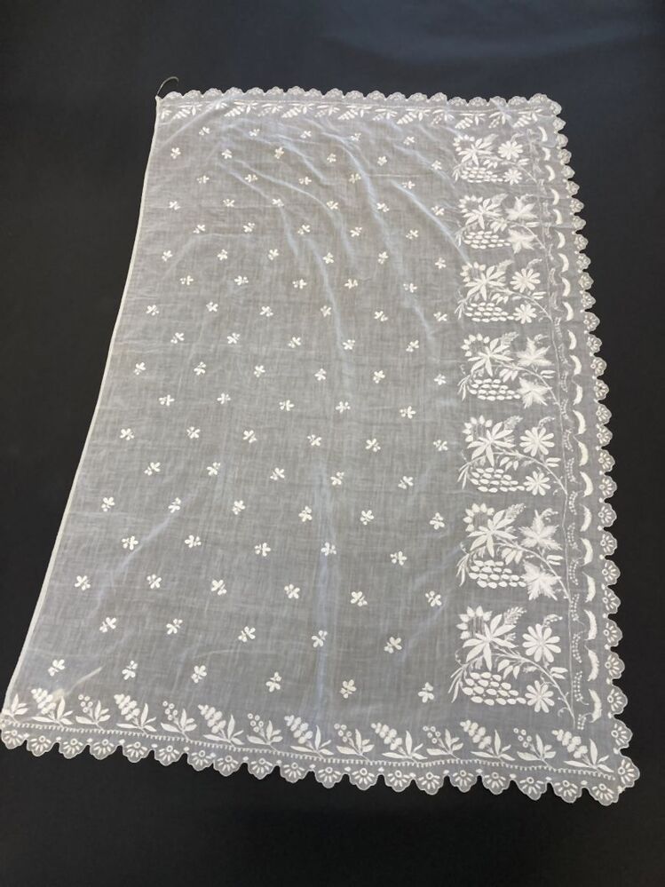Schort van wit neteldoek, getamboureerd met florale motieven, aan drie zijden voorzien van een gekartelde schulprand