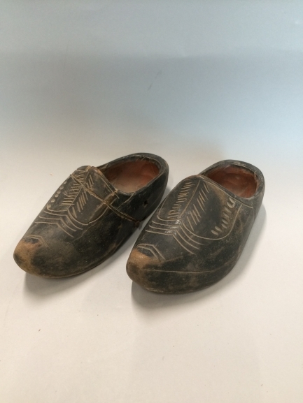 Paar zwart geverfde houten kinderklompjes waarvan één gekramd