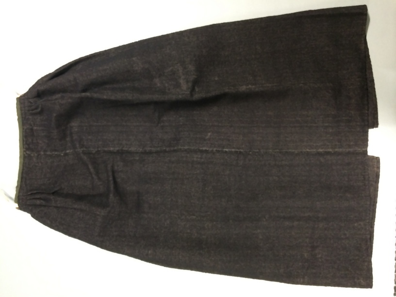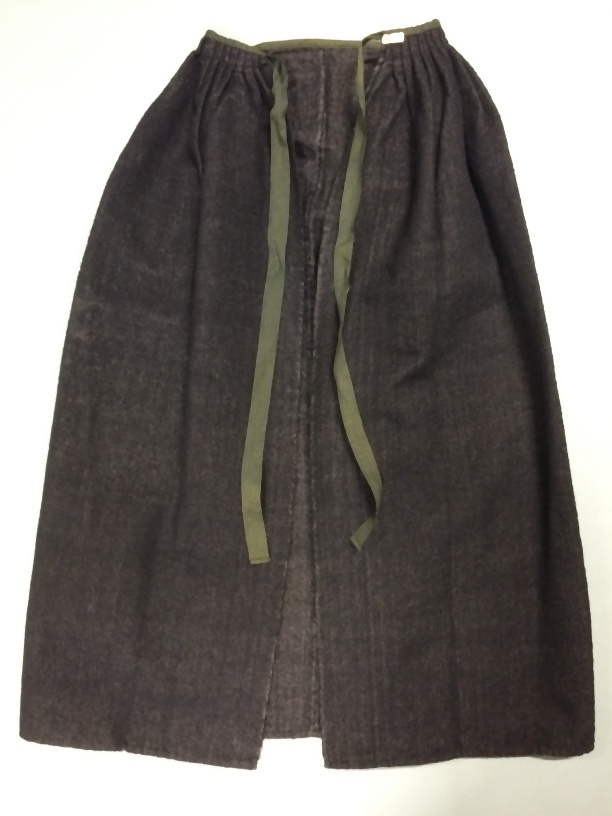 Blauw-zwart wollen schort, bij de middelband sterk gerimpeld, afgezet met zwart lint
