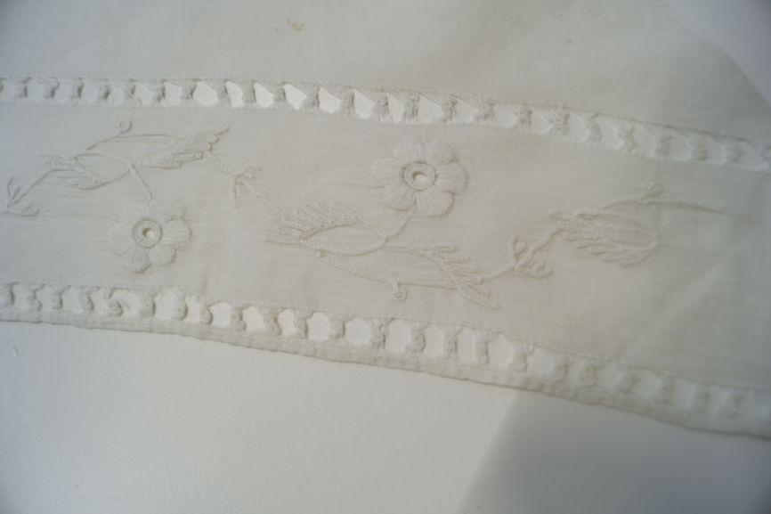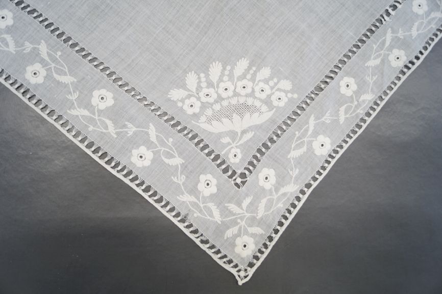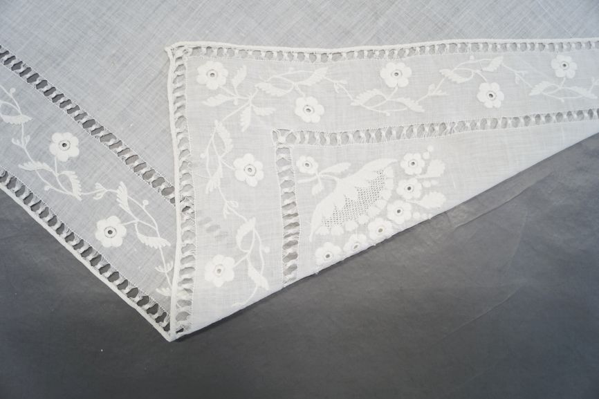 Fichu met langs de twee korte zijden een open borduurrand en golvende bloemrank