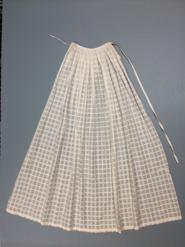 Schort van wit katoen, met ruiten, bij middelband sterk gerimpeld
