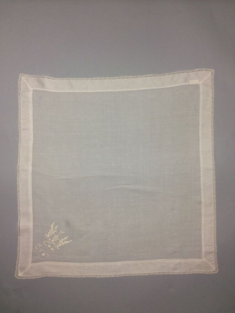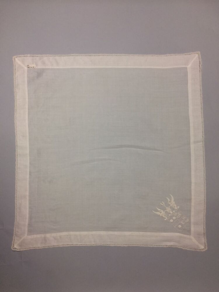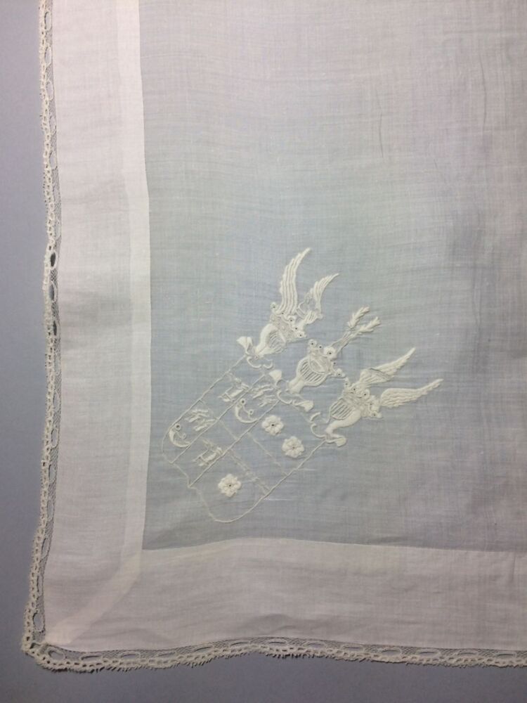 Zakdoek van wit glanzend neteldoek met wapen van Hora Siccama in één hoek, afgezet met kloskant