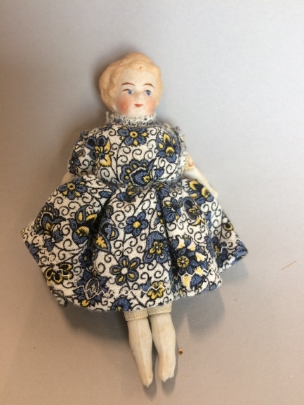 Pop uit kartonnen Rademakers hopjes doos met in totaal 10 geklede popjes van porselein