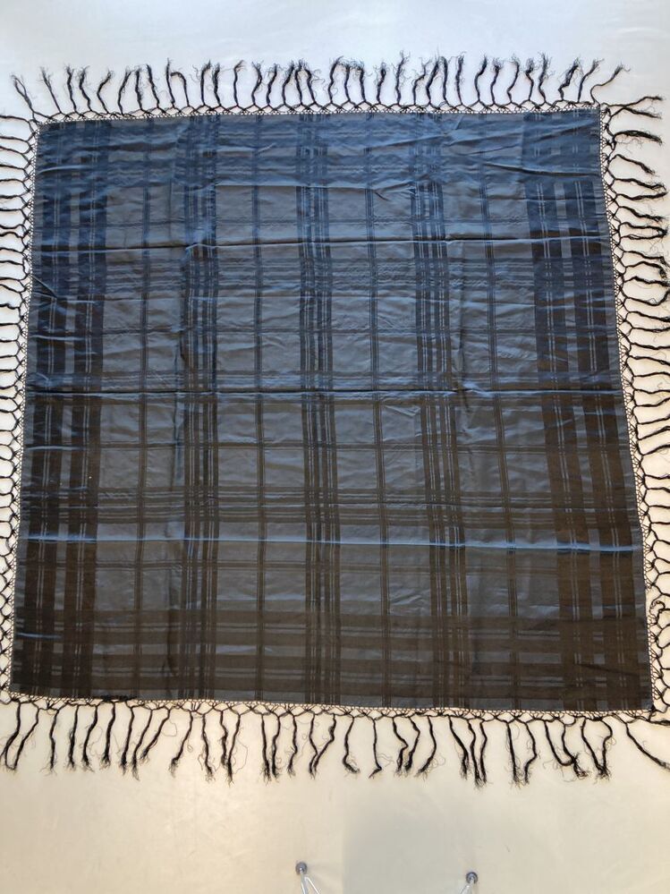 Omslagdoek van zwarte zijde damast, met geknoopte franje