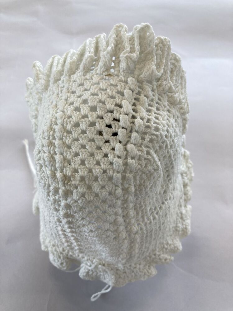 Wit gehaakt katoenen mutsje met ster in filethaakwerk en 'hanekam'