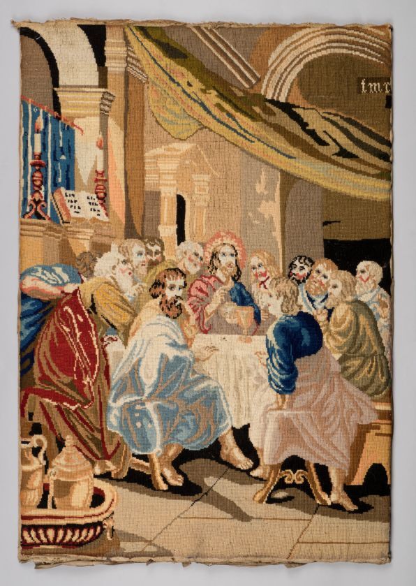 Wollen kruissteek borduursel op stramien, gespijkerd op houten paneel met voorstelling van laatste avondmaal