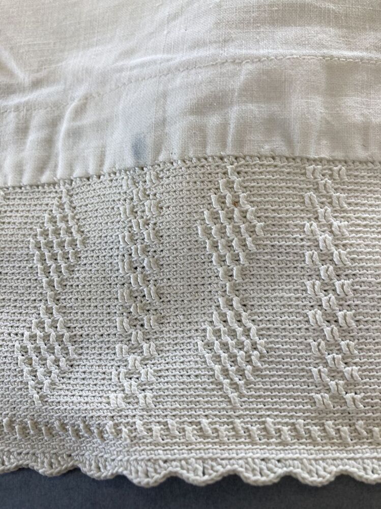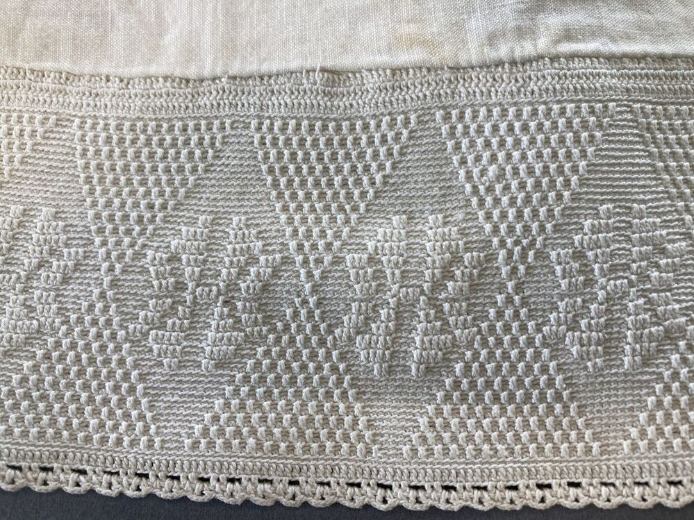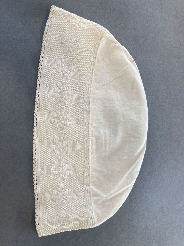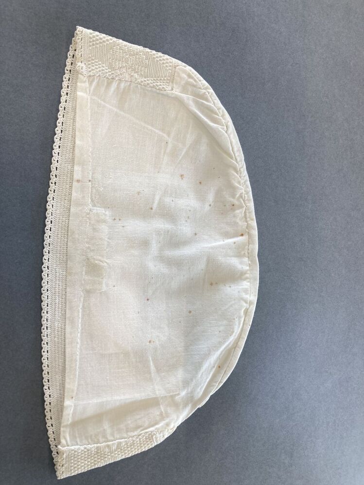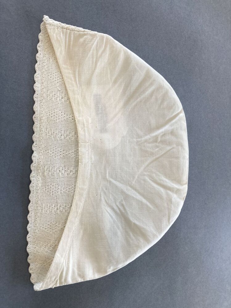 Witte katoenen ondermuts, met achterstrook in reliëfhaakwerk, aan weerszijden punten, ertussen ruit met bloem