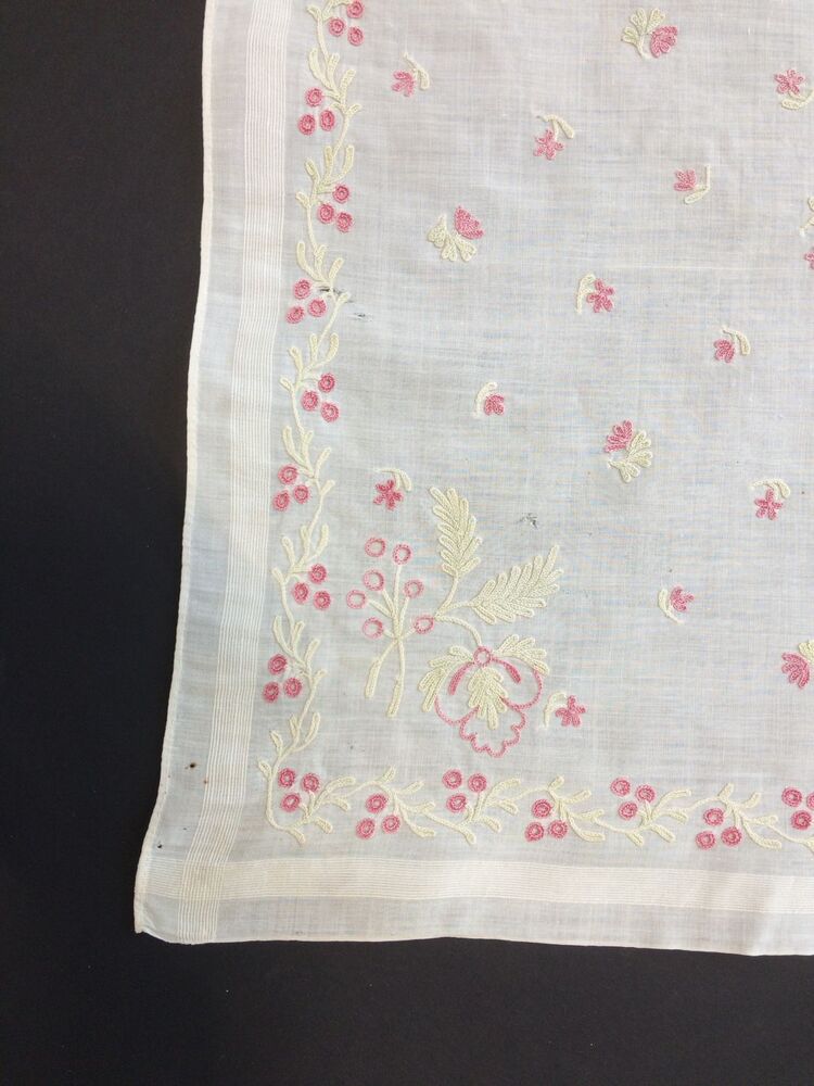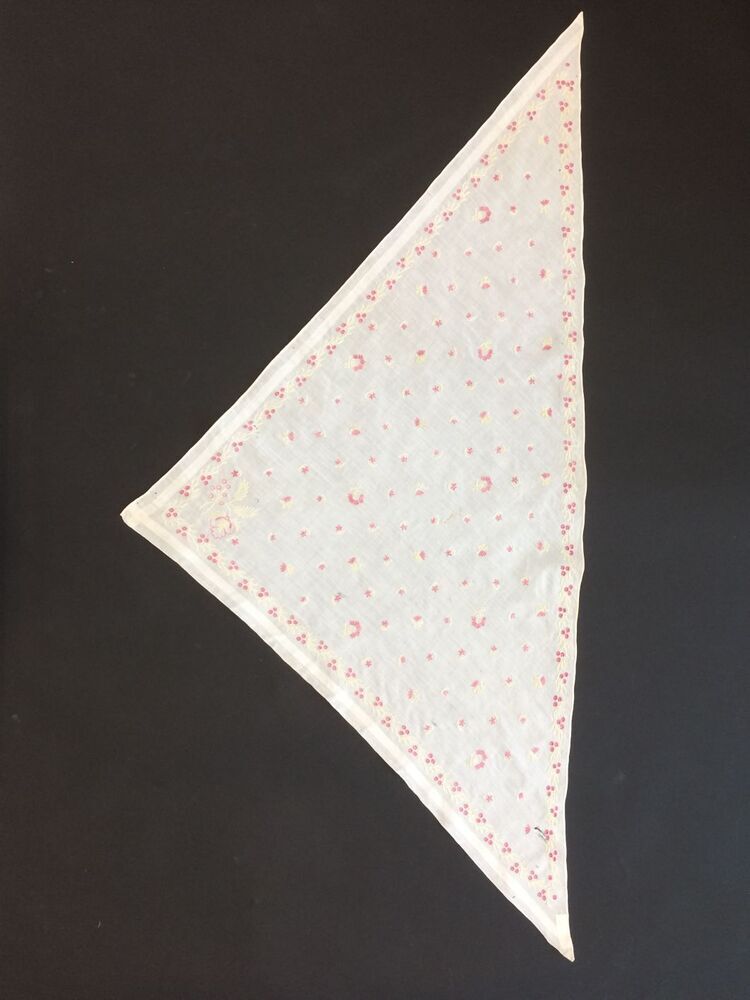 Fichu of tipdoek getamboereerd met roze en lichtgroene bloemetjes en aan alle drie zijden een bloemenrand