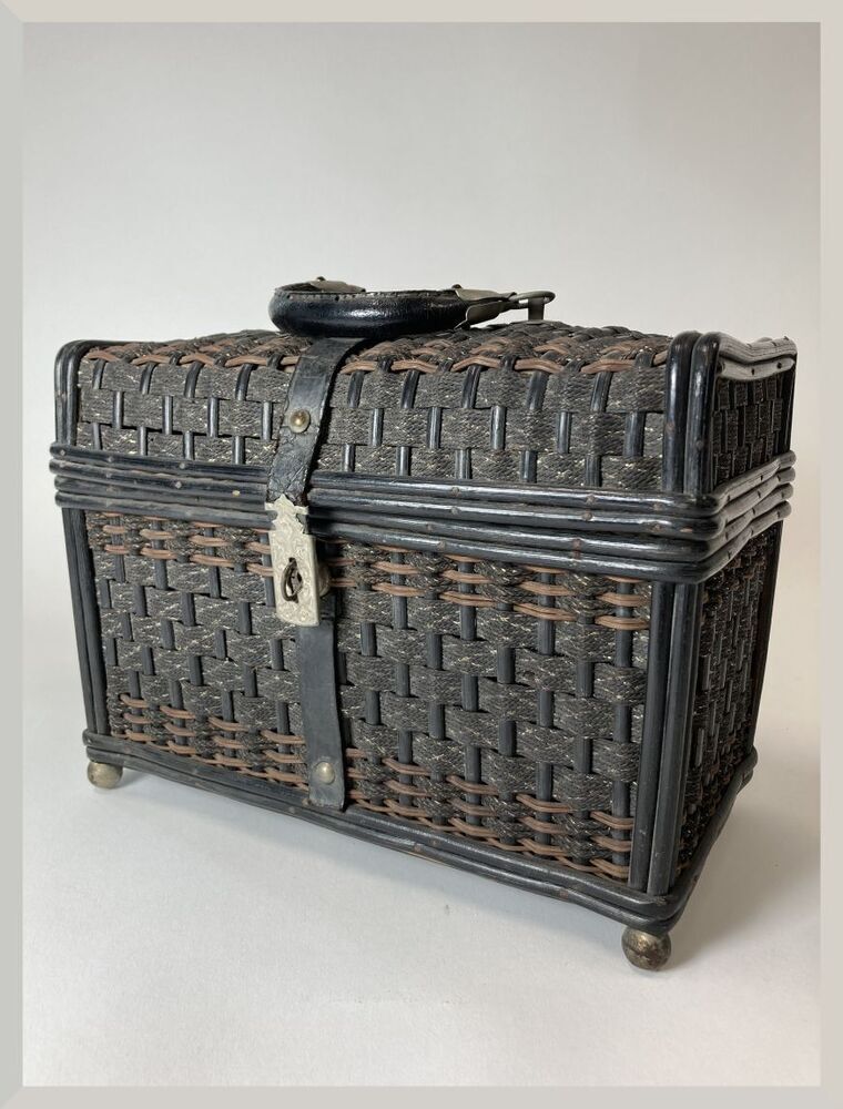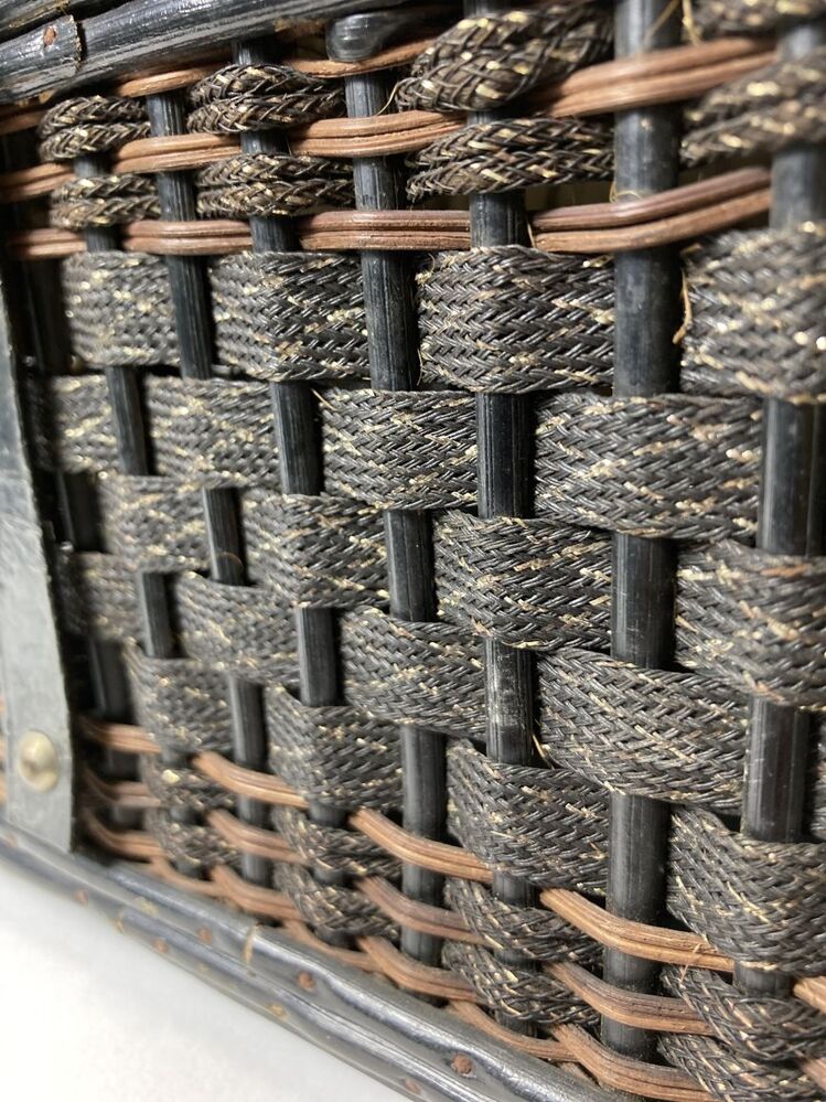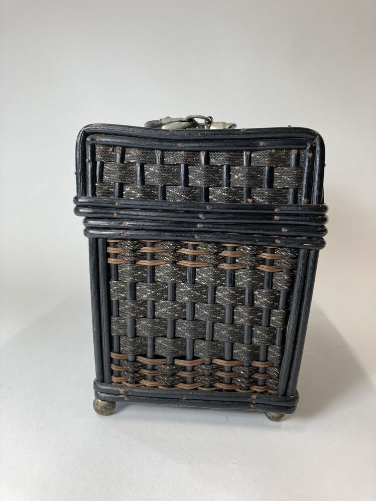 Mandje, koffermodel, van bamboe en zwarte banden met zilverborduur gevlochten, met zwart leren hengsel en zwart leren overslag, houten bodem en vier bolpootjes