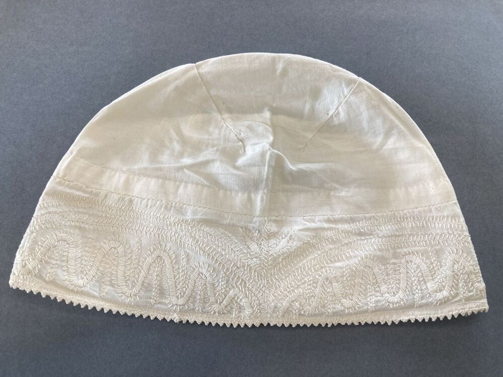 Wit katoenen ondermuts met geborduurde achterstrook met puntjes