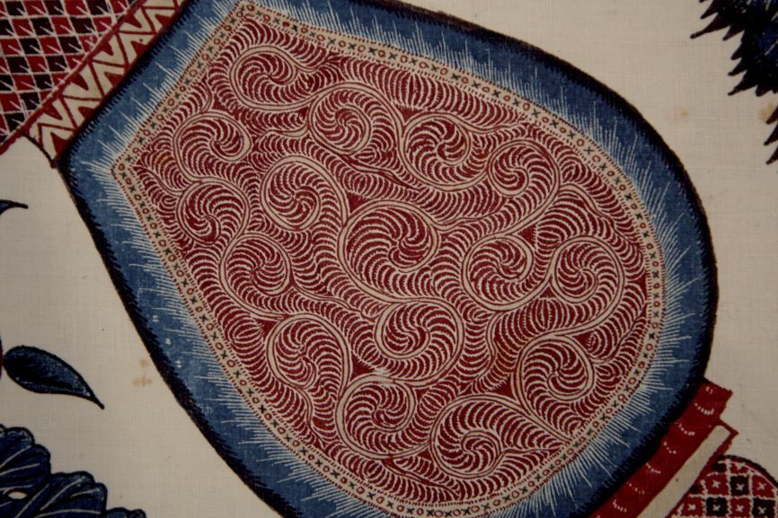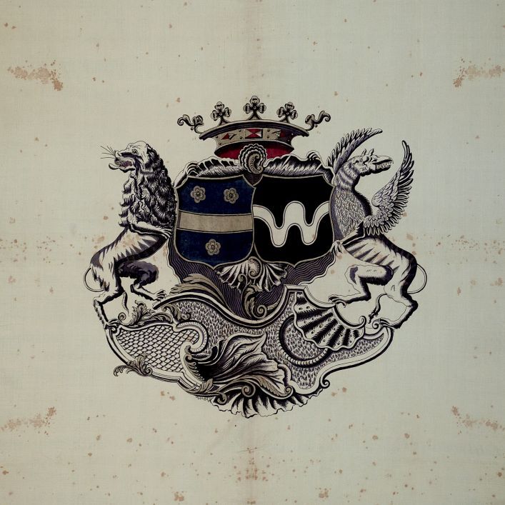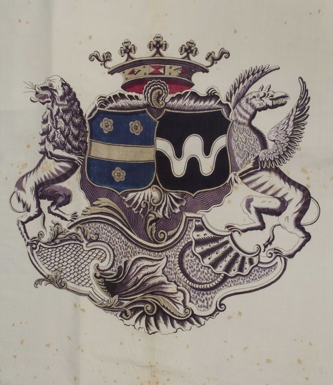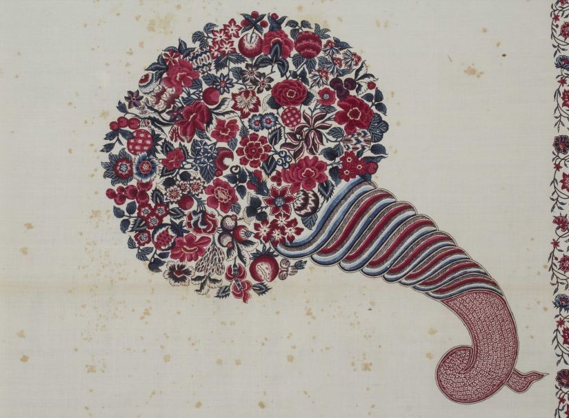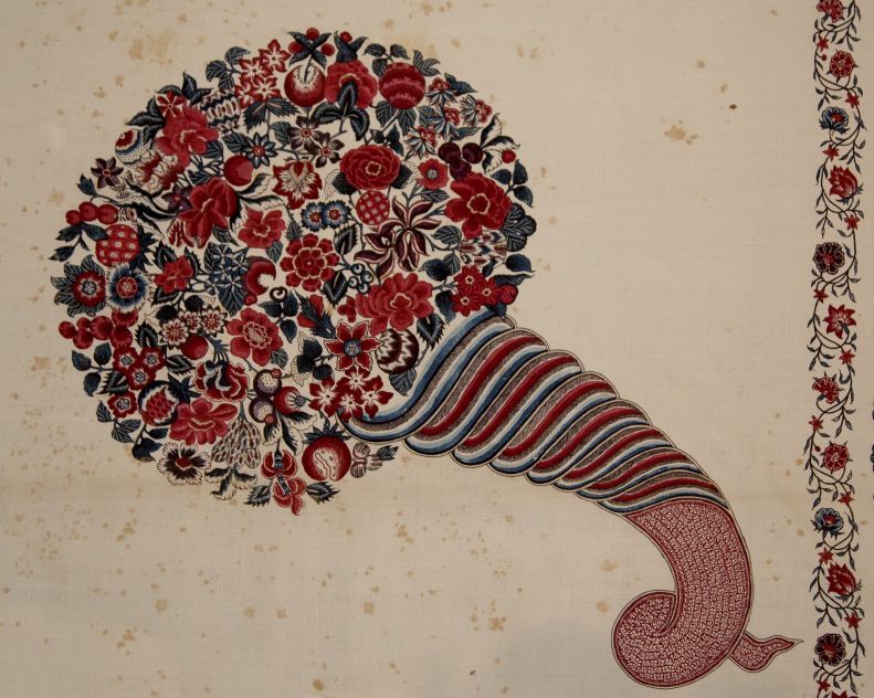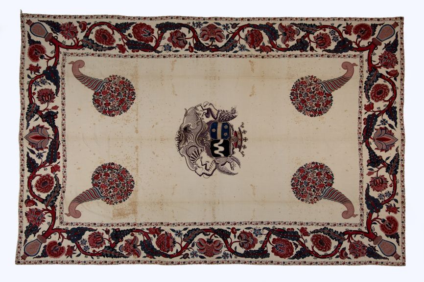 Sitsen palempore met centraal het alliantiewapen van de families Van Welderen en Rengers, hoorn des overvloeds met bloemen in de hoeken en grote golvende bloemtakken in de rand, op witte grond