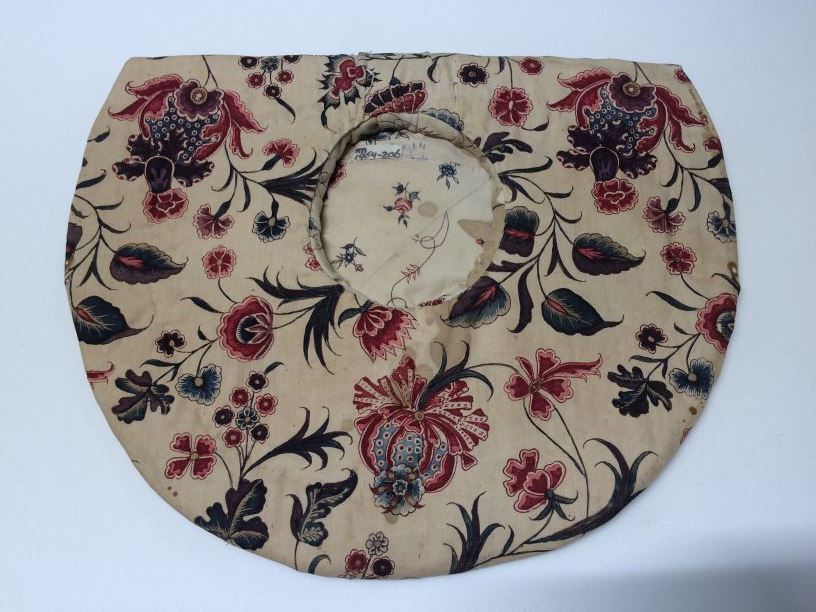 Zonhoed met sitsen voering, beschilderd met dooreengestrengelde takken met diverse bloemen op witte grond