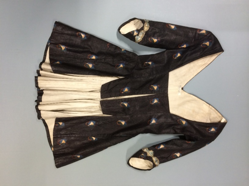Sitsen vrouwenjak met kleine vestpandjes, bedrukt met hoornvormig strooimotief op zwarte grond