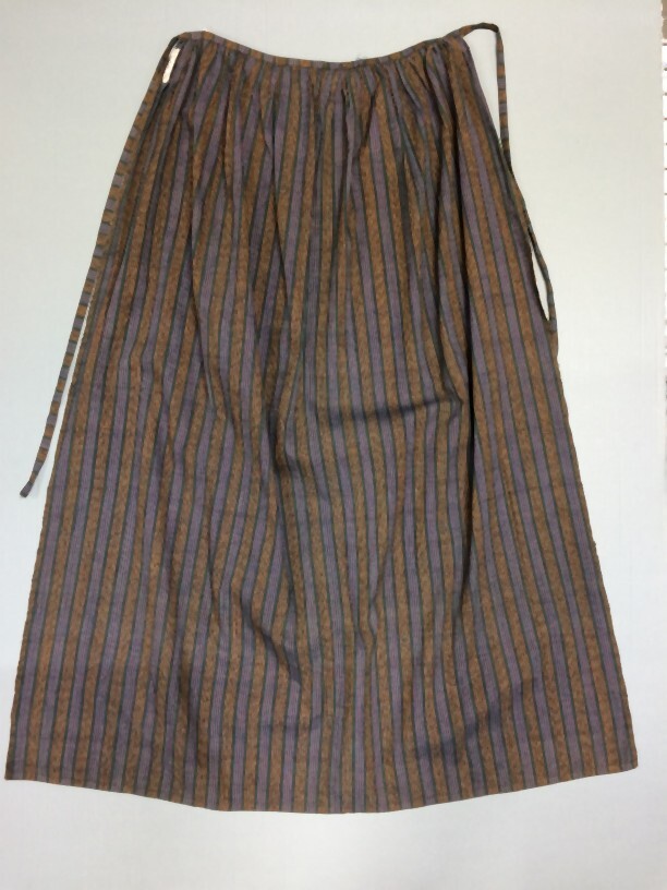 Katoenen schort, bedrukt met verticale bruine, groene en blauwe met rode strepen