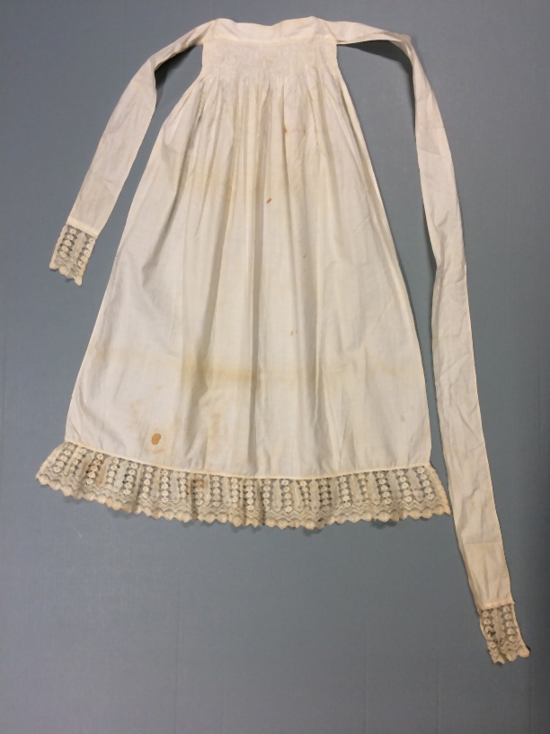 Wit katoenen schort met gesmokt boveneinde, aan de onderkant een rand van kloskant