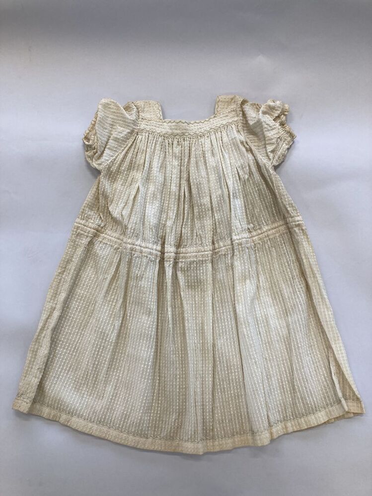 Wijd gerimpeld jurkje van wit katoen met genopte strepen, met korte pofmouwen