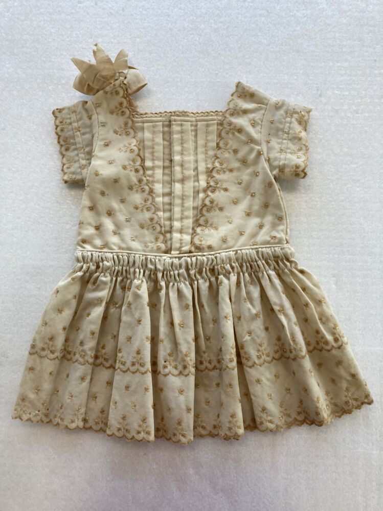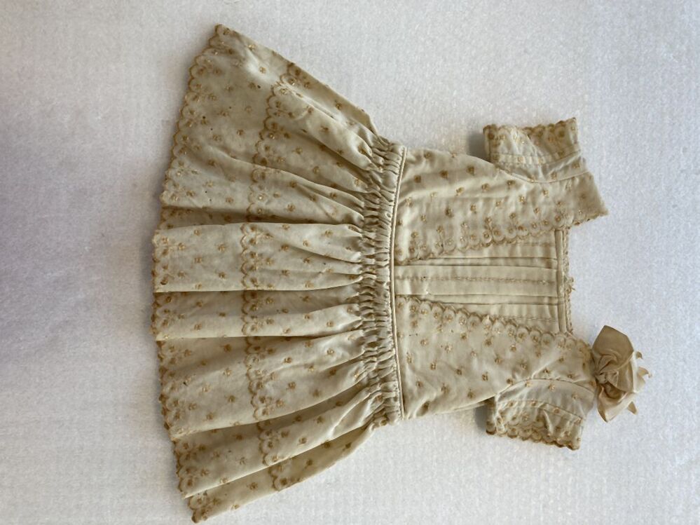 Crème jurkje van zeer fijn wollen stof geborduurd met goudgele zijde
