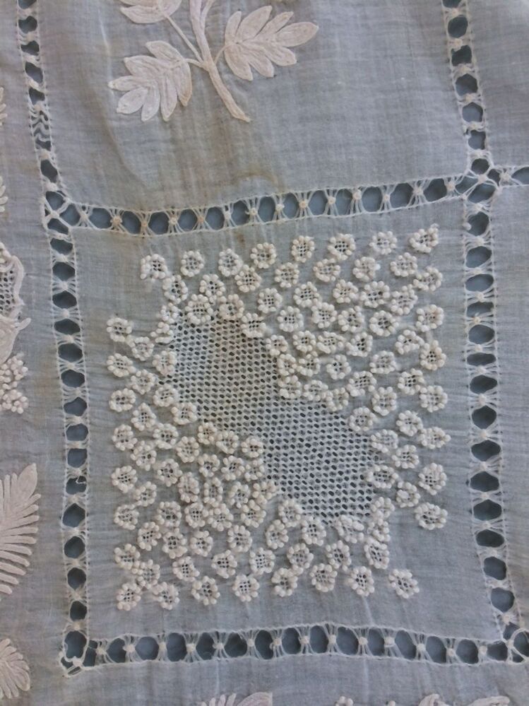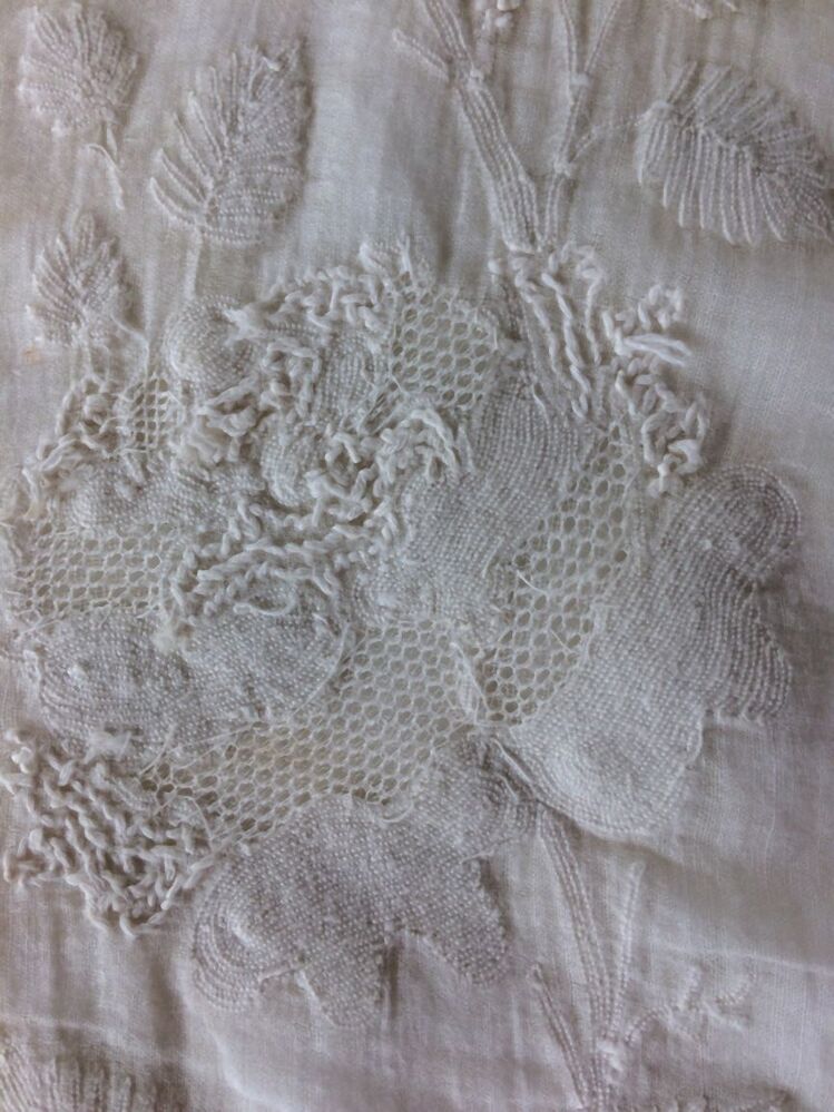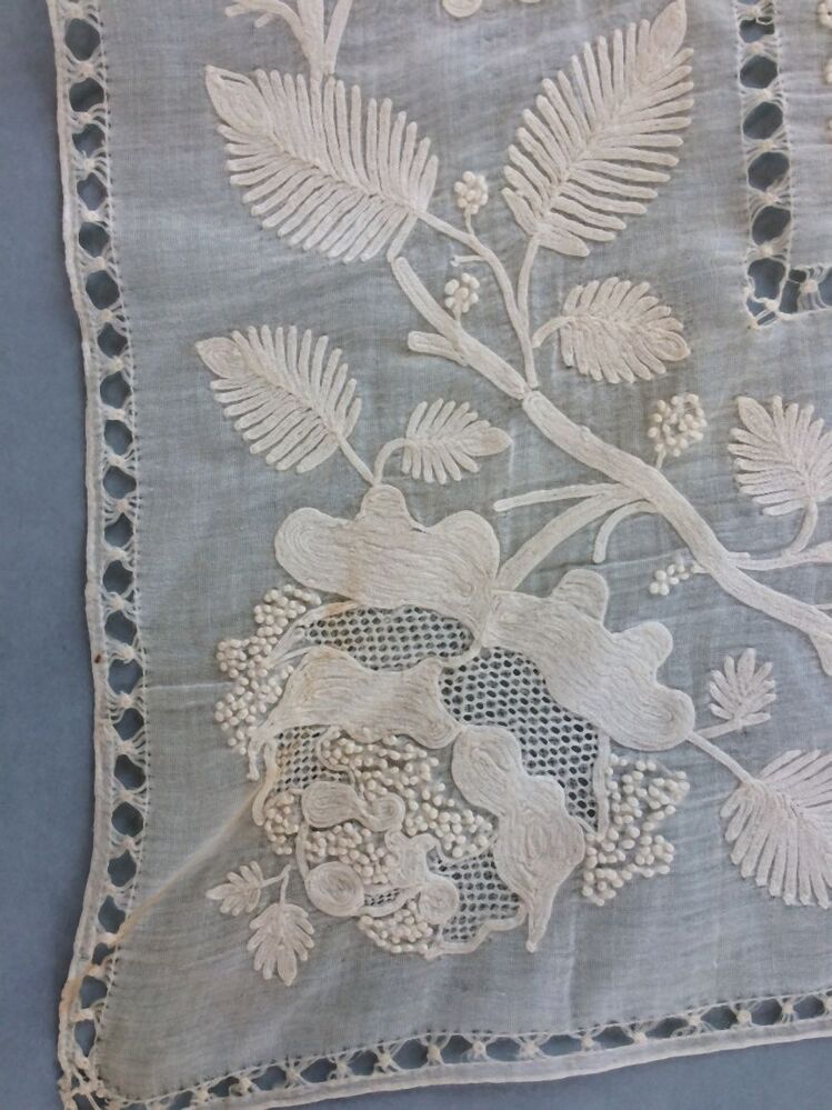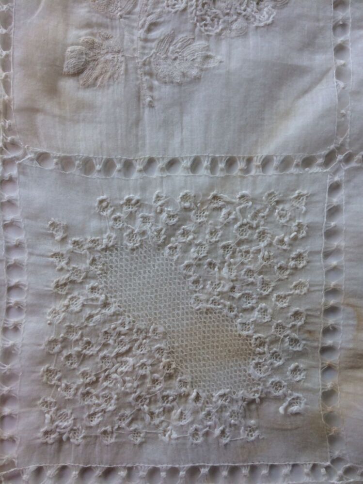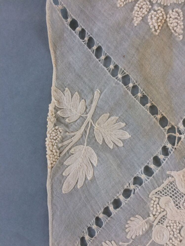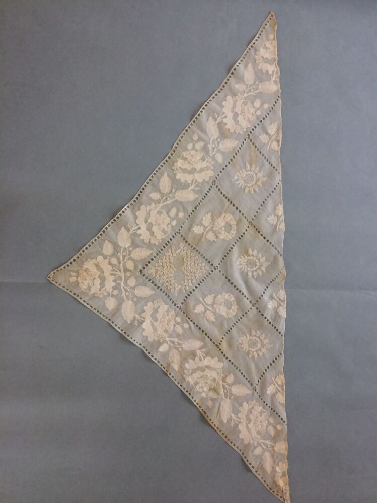 Fichu of tipdoek van wit neteldoek met grote ruiten van ajourranden met grote bloemmotieven erin en bloemenrand