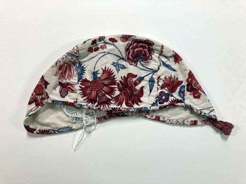 Sitsen meisjesmuts, met naturalistische bloemen, insekten en rode pluisjes op witte grond