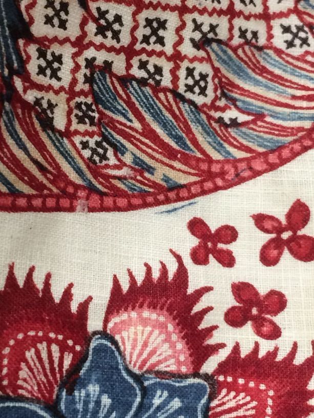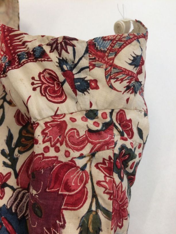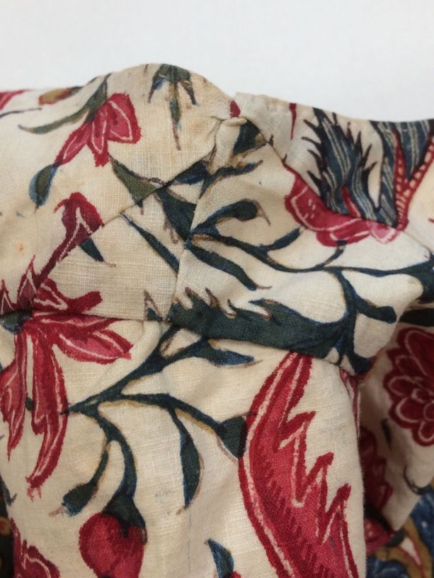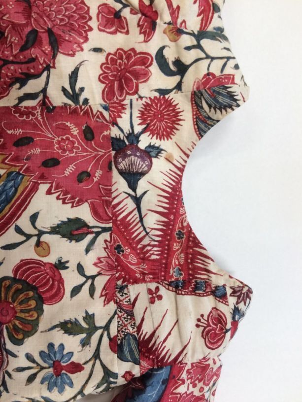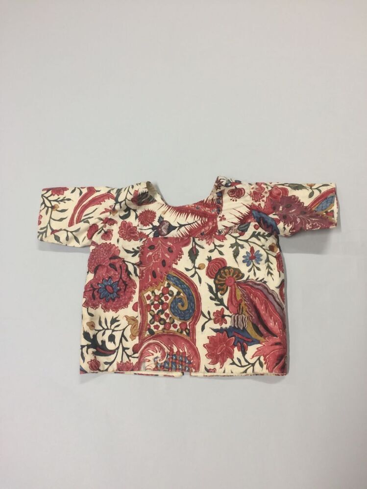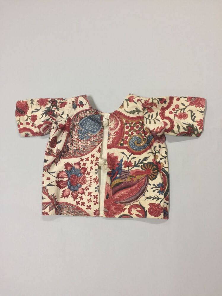 Sitsen babyjakje met korte mouwen, gemaakt van twee stoffen met een groot 'bizar' bloemenpatroon op witte grond