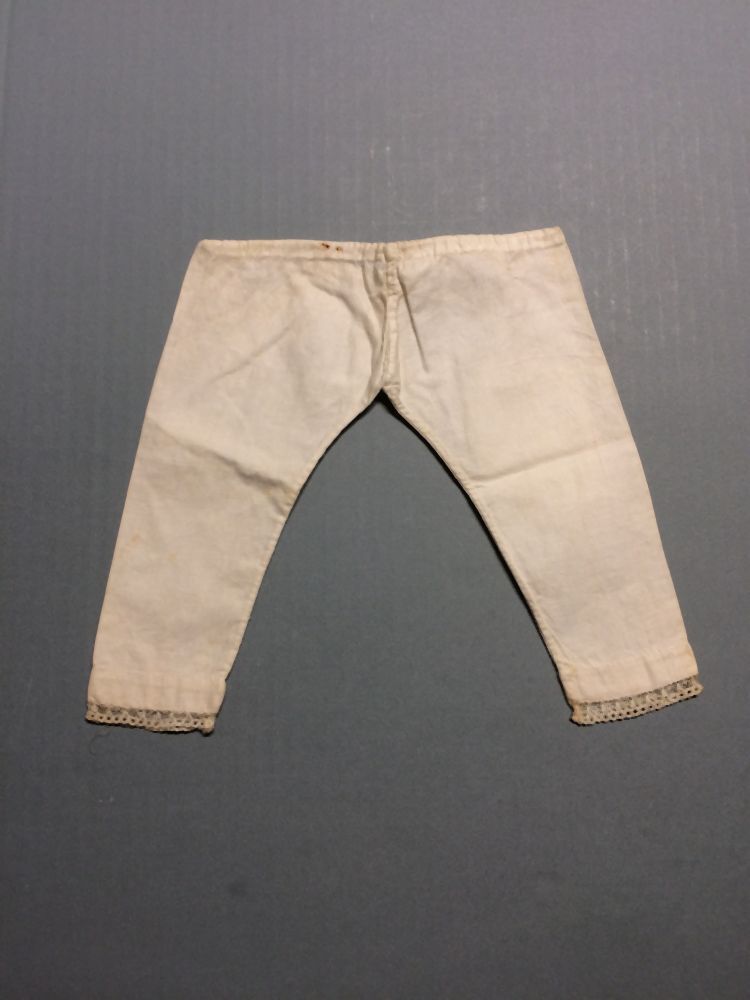 Lange poppenonderbroek van wit katoen met tulekantje pijpen, onderdeel van groep van drie
