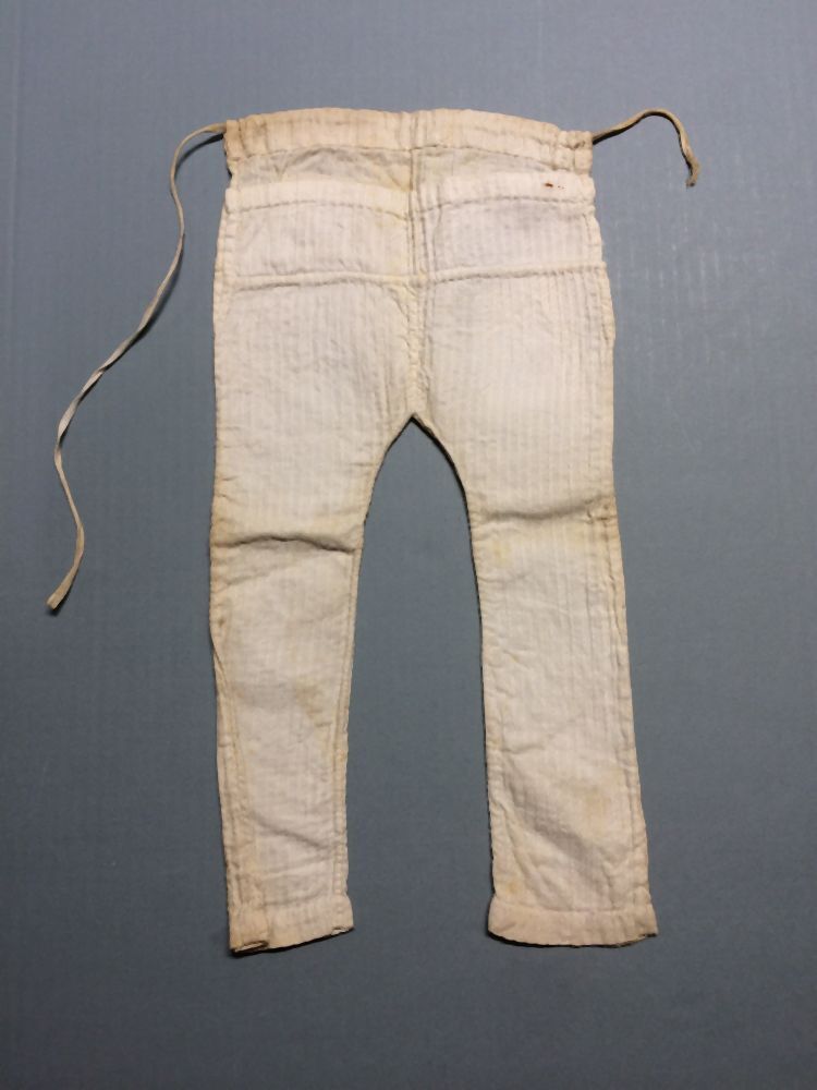 Wit katoenen poppenbroek versierd met verticale kabelrandjes, onderdeel van groep van twee