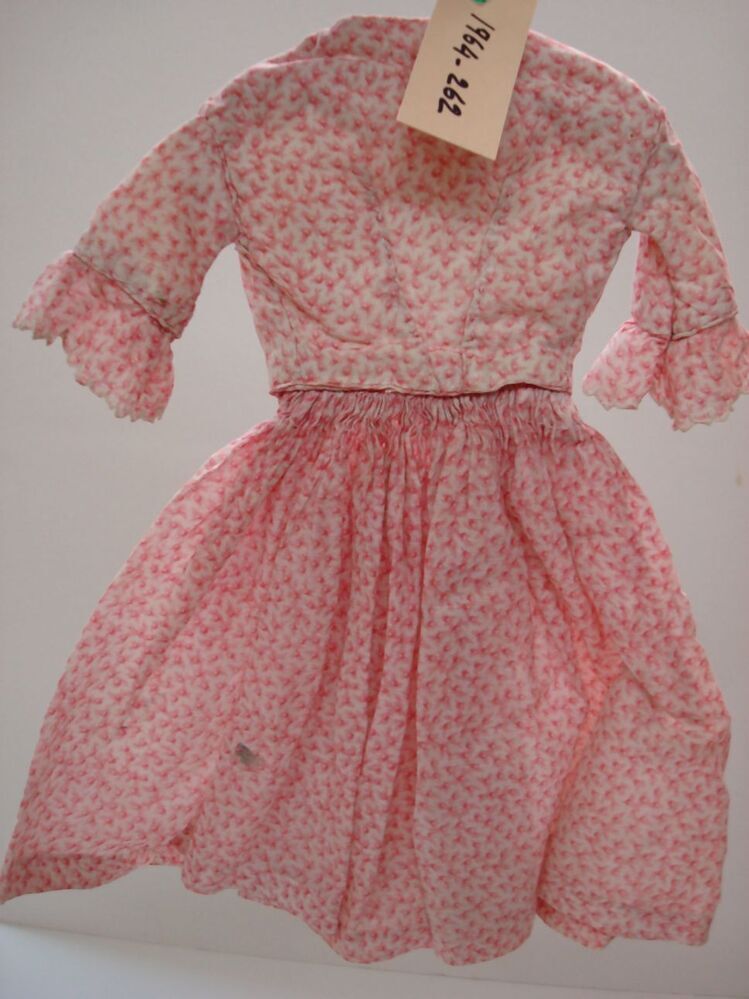 Poppenjurk van roze-wit bedrukte stof, met pagode mouwtjes