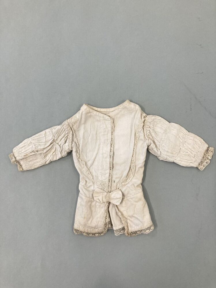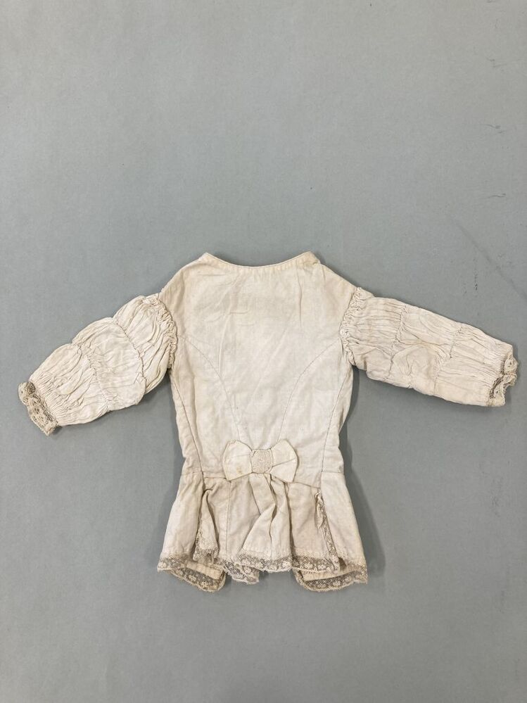 Wit heuplang jakje met ingeweven dessin met kort schootje, gerimpelde mouwen, afgewerkt met kloskant