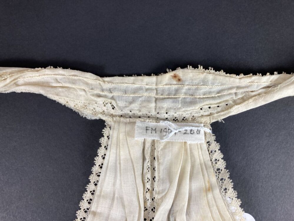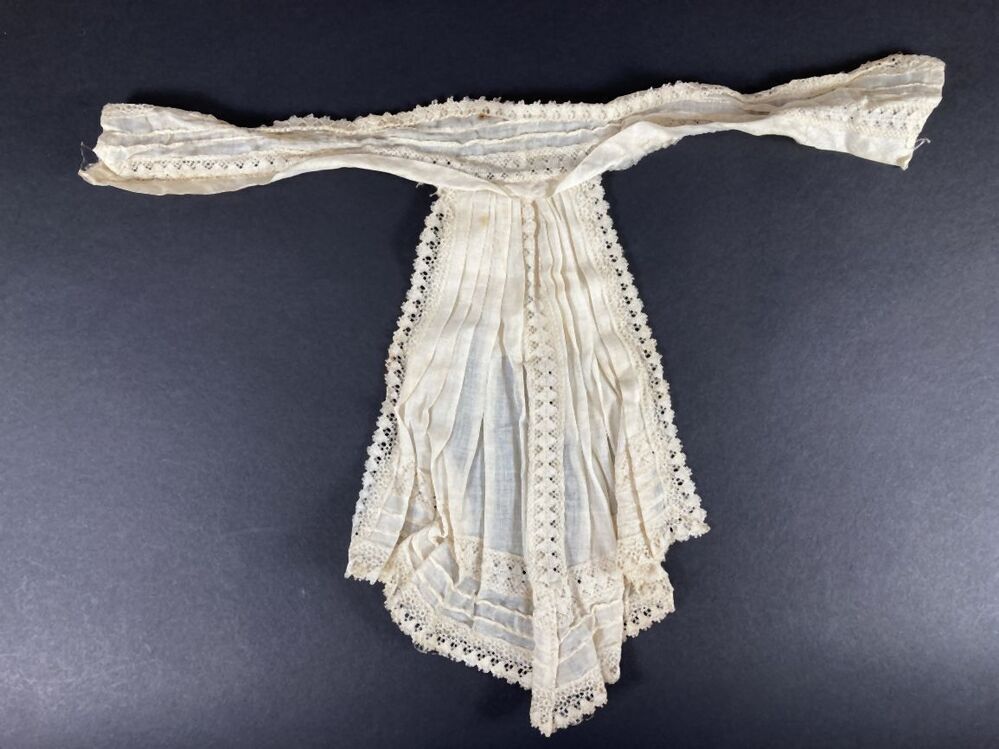 Kraag met jabot van creme katoen, afgezet met machinaal kant