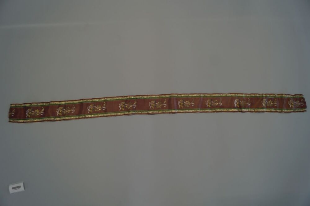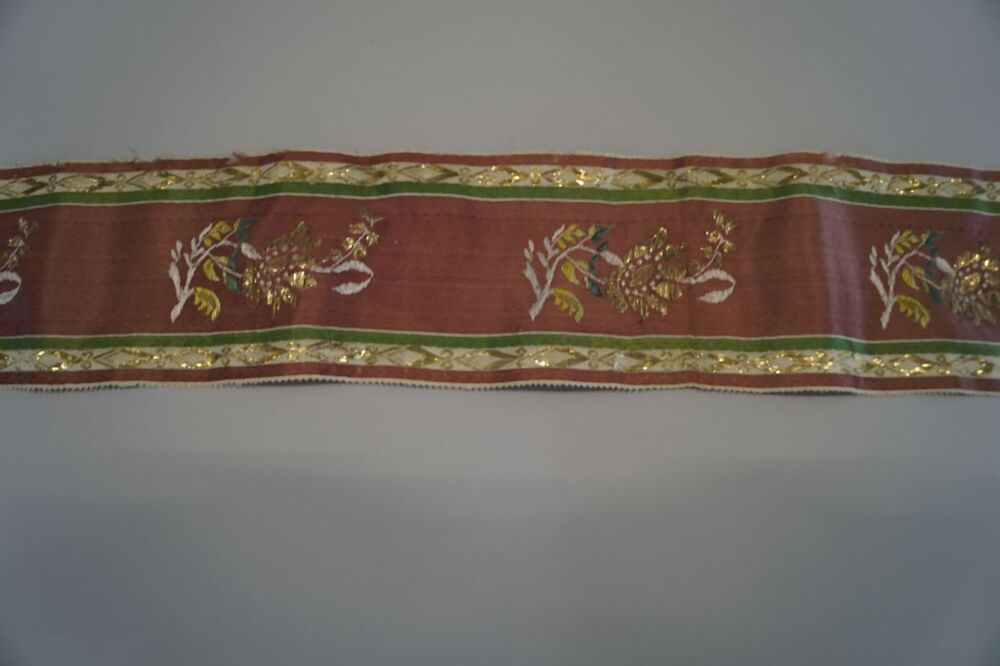 Zijden zonhoedlint met gebrocheerde bloemtakken in oudroze, groen wit en gouddraad