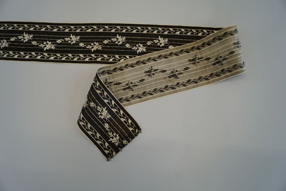 Zwart zijden zonhoedlint met zwart fond en witte streepjes en bloemtakjes