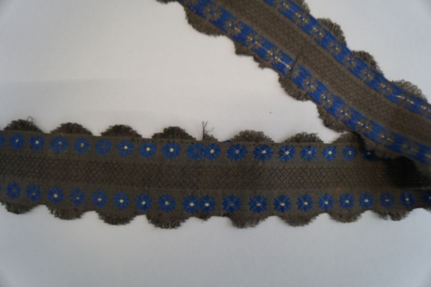 Geschulpt zwart zijden lint met blauw-witte bloemenrandjes