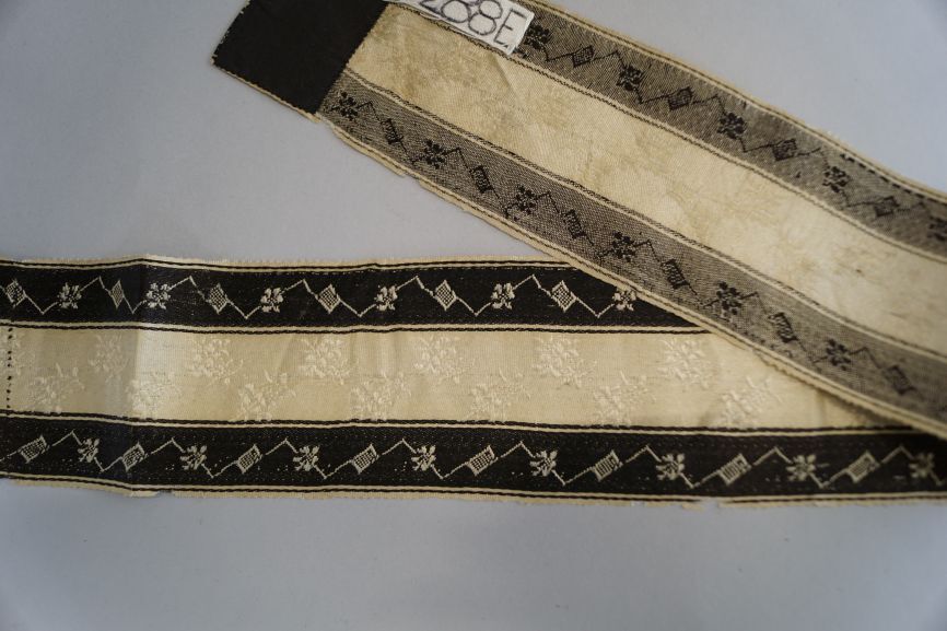 Lint van zwarte en witte zijde met strepen in zigzag, bloemen en blokjes