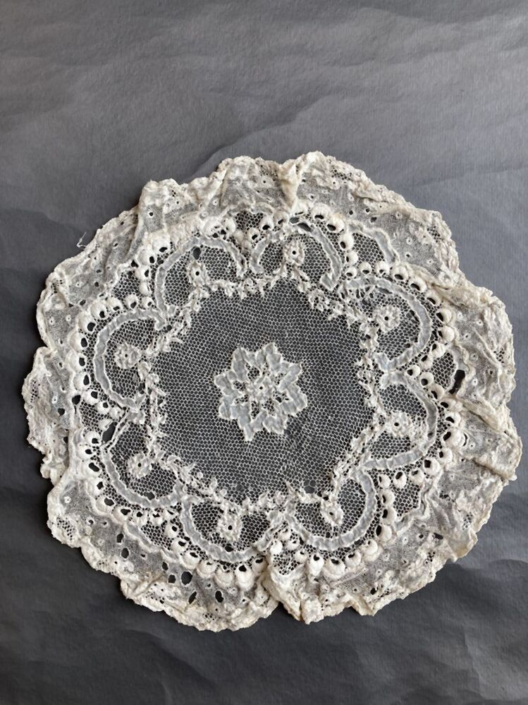 Rond wit kanten kleedje van geborduurde en geapplikeerde tule met kanten rand