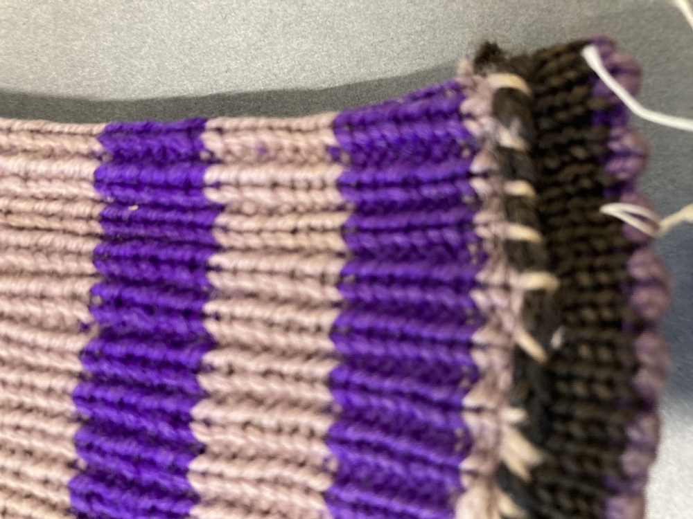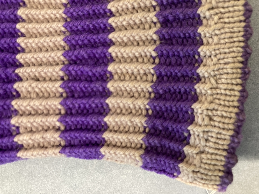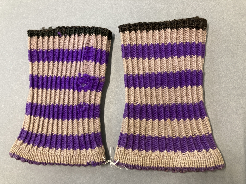 Paar beige-paarse mouwtjes, of polsmofjes, met zwarte rand