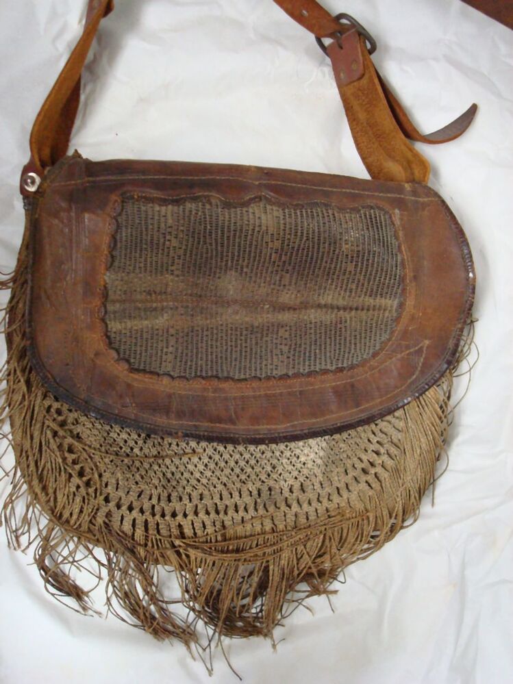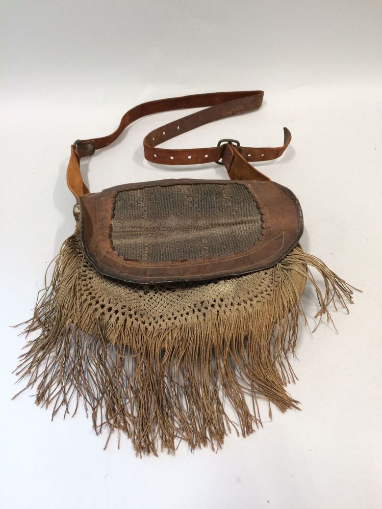 Weitas, bruin leren tas met aangehechte tas van keper katoen en voorzien van gehaakte versiering met franje