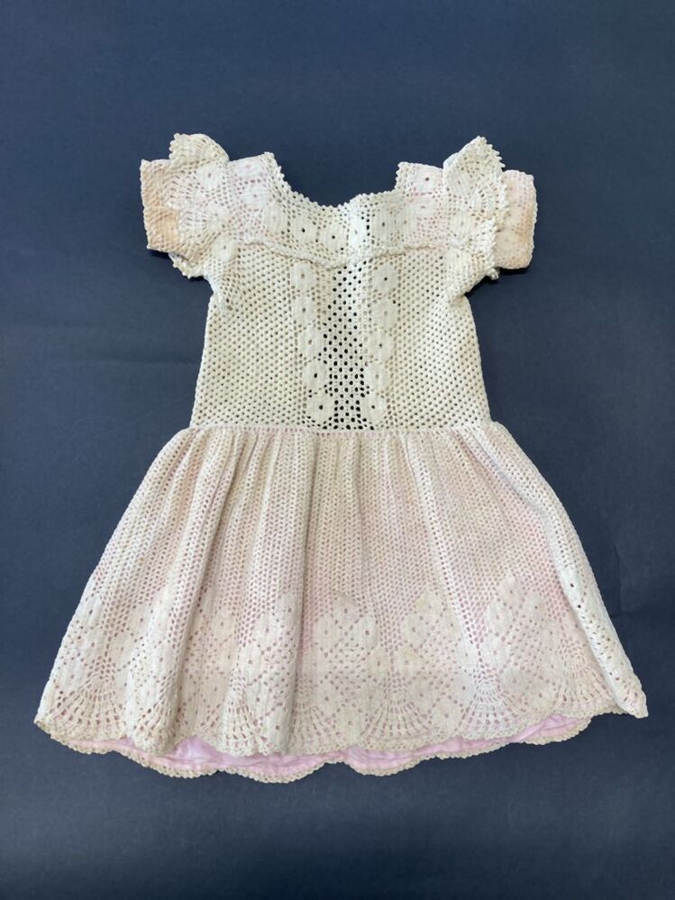 Gehaakt jurkje van crème katoen, met in de rok en de mouwen een roze katoenen voering