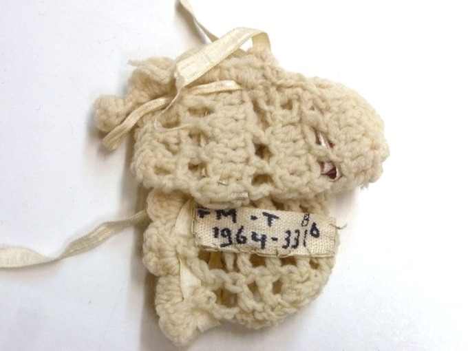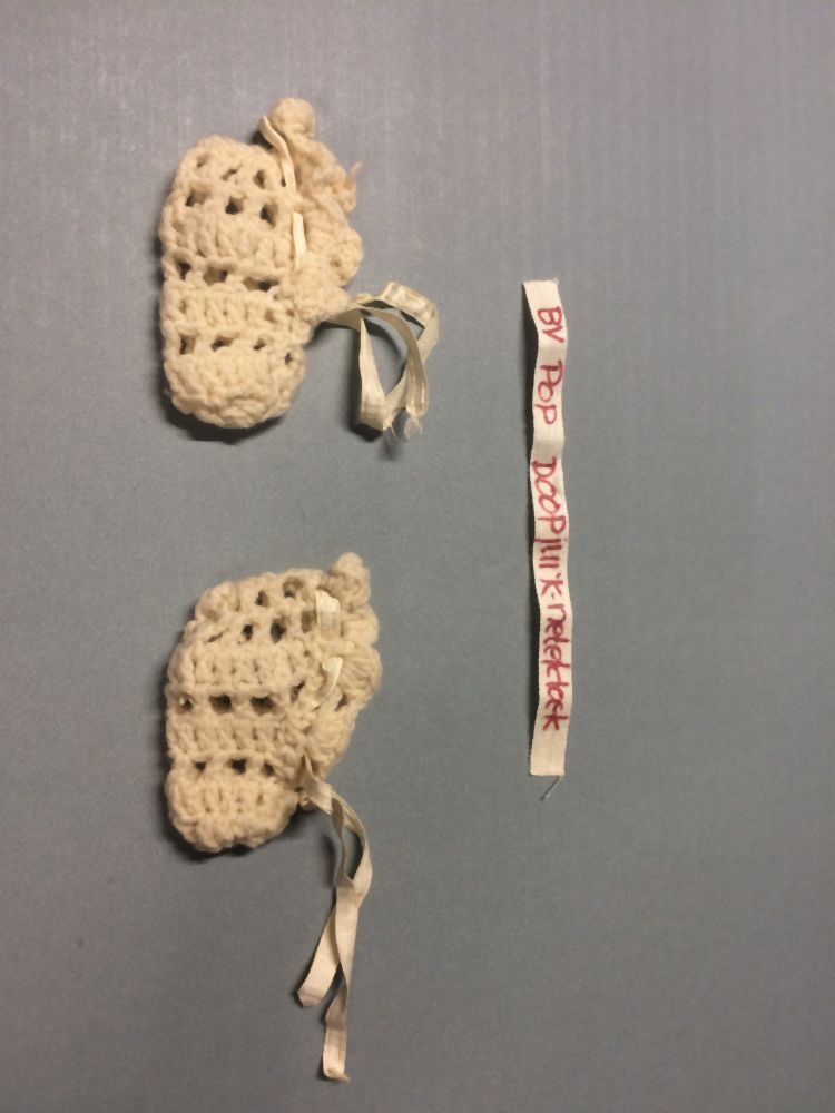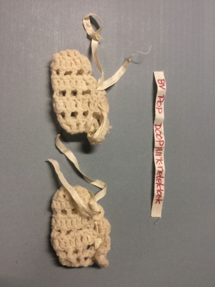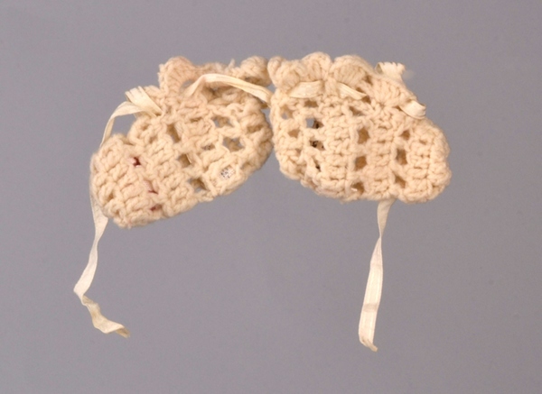 Wit gehaakt sokje van wol, bovenzijde heeft eenzelfde lintje als de doopjurk, onderdeel kleding bakerpop