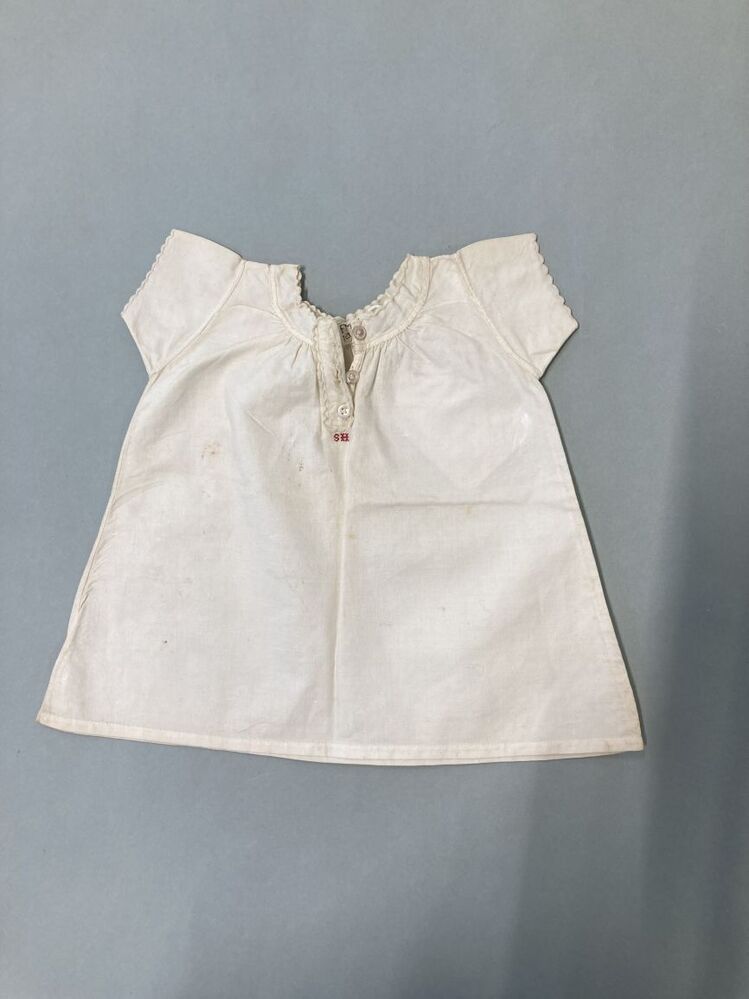 Wit katoenen poppenhemdje met korte mouwtjes, onder het split in rood gemerkt SH