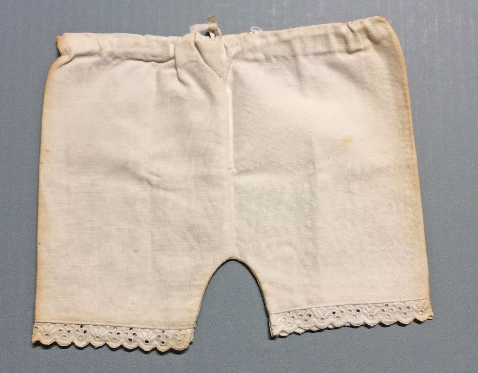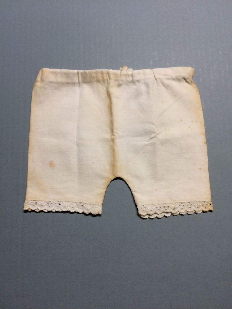 Poppenbroek van wit katoen met ajourrandje om de pijpen