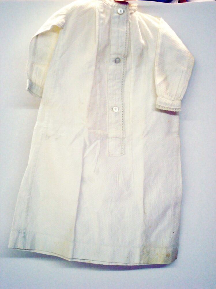 Wit nachthemd van gespikkeld katoen, split en parelmoer knopen, manchet, boord en knoopssluiting zijn afgezet met broderie