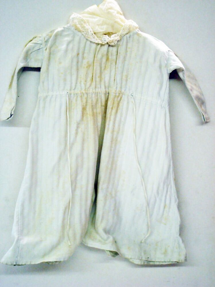 Wit nachthemd van gestreept katoen met pas en lange mouwen, knooppatte van boven naar beneden afgezet met machinale kant
