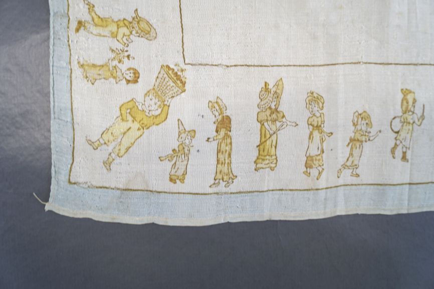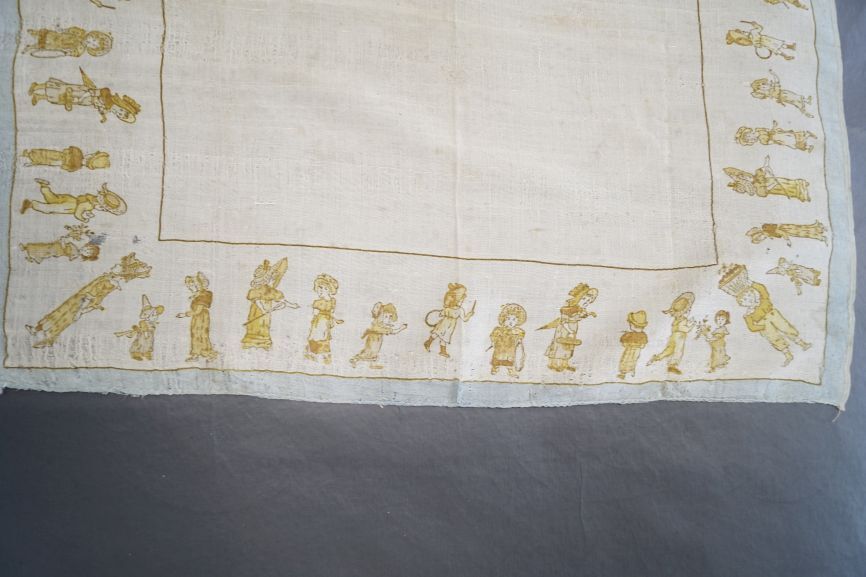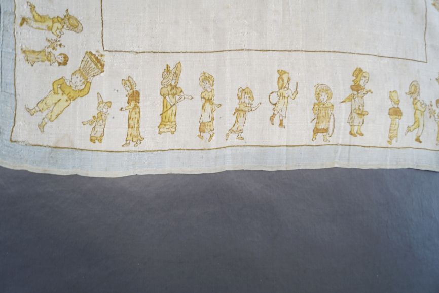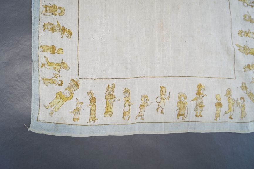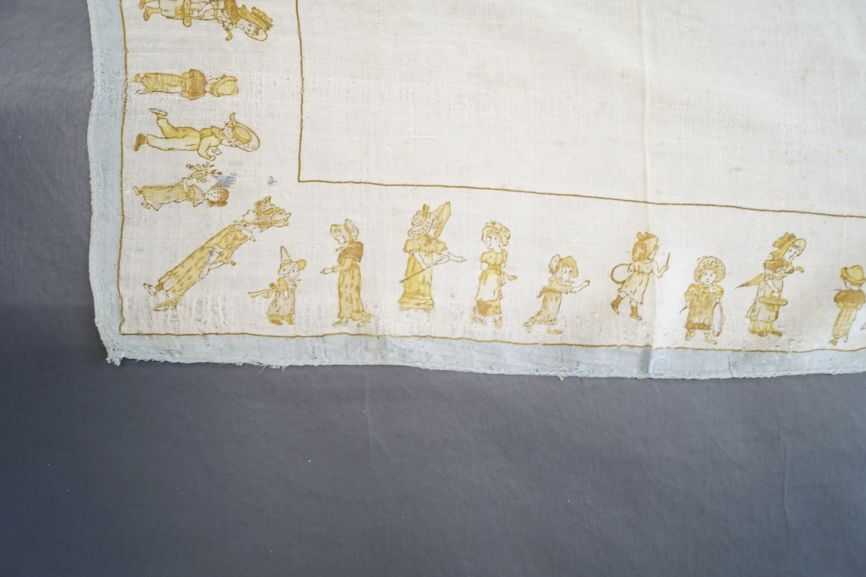 Grof zijden creme zakdoek met langs de kanten een gedrukte rand met spelende kinderen, ontwerpen van Kate Greenaway, rondom lichtblauw randje